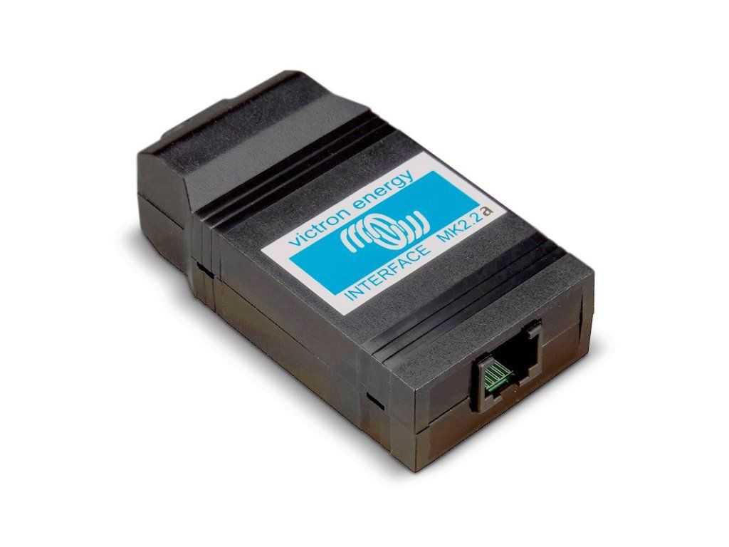 The MK2.2b computer interface is used for the software setup of the Phoenix series inverters and the MultiPlus and Quattro series inverter/chargers. All these devices have standard factory settings. This interface is used to change the standard settings. Parameters such as the voltage values for disconnecting and reconnecting the load, the nature of the charging voltage, the nature of the connection to the mains depending on the battery voltage or draw, and much more can be changed. On one side of the device there is an RS232 output for connection to a computer, on the other side there is a socket for connecting an RJ45 UTP cable which connects to the device being set up (not included). This is an optional device that is not absolutely necessary for the operation of the setup devices.Additional parameters