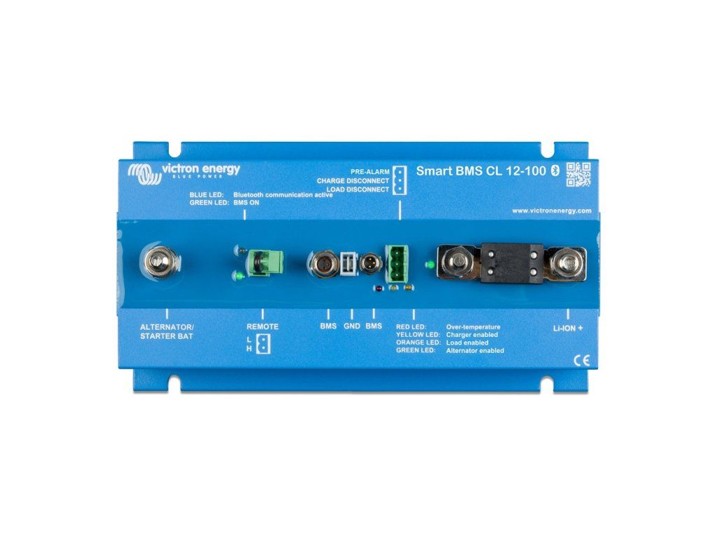 Victron Energy Smart BMS CL 12-100 Specially designed for use in vehicles and boats with 12V DC installation. Maximum current 100A. Battery Management System BMS The BMS is used to connect 12.8V Victron LiFePO4 (LFP) batteries to the system. Up to 5 batteries can be connected in parallel. The BMS can be used as an on/off switch for the system. Alternator and battery protection The input current is electronically limited to approximately 90% of the fuse rating. For example, a 100A fuse will limit the input current to approximately 90A. Selecting the correct fuse: a. Protects the LFP battery from excessive charging current (important in the case of a low capacity LFP battery). b. Will protect the alternator from overcharging in the case of a high capacity LFP battery (most 12V alternators will overheat and fail if run at maximum output for more than 5 minutes). Starter battery protection This feature is similar to the Cyrix Battery Combiner or Argo FET Battery Isolator. Current can only flow to the LFP battery if the input voltage (starter battery voltage) exceeds 13V. Current cannot flow back from the LFP battery to the starter battery, preventing possible damage to the LFP battery due to over-discharge. Li-ion battery protection Excessive input voltage and voltage spikes are regulated to a safe level. The Smart BMS CL will stop charging in the event of overvoltage or overheating of the cell. It has three outputs similar to a miniBMS: Load shedding output The load output is normally energized and will disconnect in the event of impending cell undervoltage (default is 2.8 V/cell, adjustable between 2.6 V and 2.8 V per cell). Maximum current: 10 mA. The Load output can be used to control the Battery Protect input, inverter, DC-DC converter or other loads. Output for pre-alarm The pre-alarm output can be used as a warning when the battery voltage is low, and will turn on shortly before deactivating the load disconnect output due to insufficient cell voltage. The pre-alarm output can be used to control a relay, LED or buzzer. It can be configured as a continuous or intermittent signal. The pre-alarm output is normally off and will turn on in the event of impending cell undervoltage (default 3.1 V/cell, adjustable between 2.85 V and 3.15 V per cell). Maximum current: 1A (not short-circuit protected) The minimum delay between the pre-alarm output switching on and the load disconnection is 30 seconds. 30 seconds to disconnect the charge output The charging output is normally active and will deactivate in the event of impending overvoltage or overheating. Maximum current: 10 mA. The charging output is not suitable for powering inductive loads such as relay coils or contactors. The charge output can be used to control: remote on/off charger, Cyrix-Li-Charge relay, Cyrix-Li-ct battery jumper. (Note: in some cases a jumper cable will be required, see manual.) Remote on/off control The on/off remote control controls charging by the alternator. When off, alternator charging is disabled while the BMS function remains active so that all loads and chargers can continue to operate regardless of the remote control status. If the "system on/off switch" is disabled using the VictronConnect app, the BMS function will also be disabled. The connector contains two contacts, Remote L and Remote H. The switch or relay contacts connect to the non-H and L contacts. Alternatively, the BMS can be turned on by connecting the H contact to the plus pole, or the L contact to the minus pole of the battery. Ignition protection The BMS does not contain relays, but MOSFET switches that do not spark or produce voltage spikes.Additional parameters