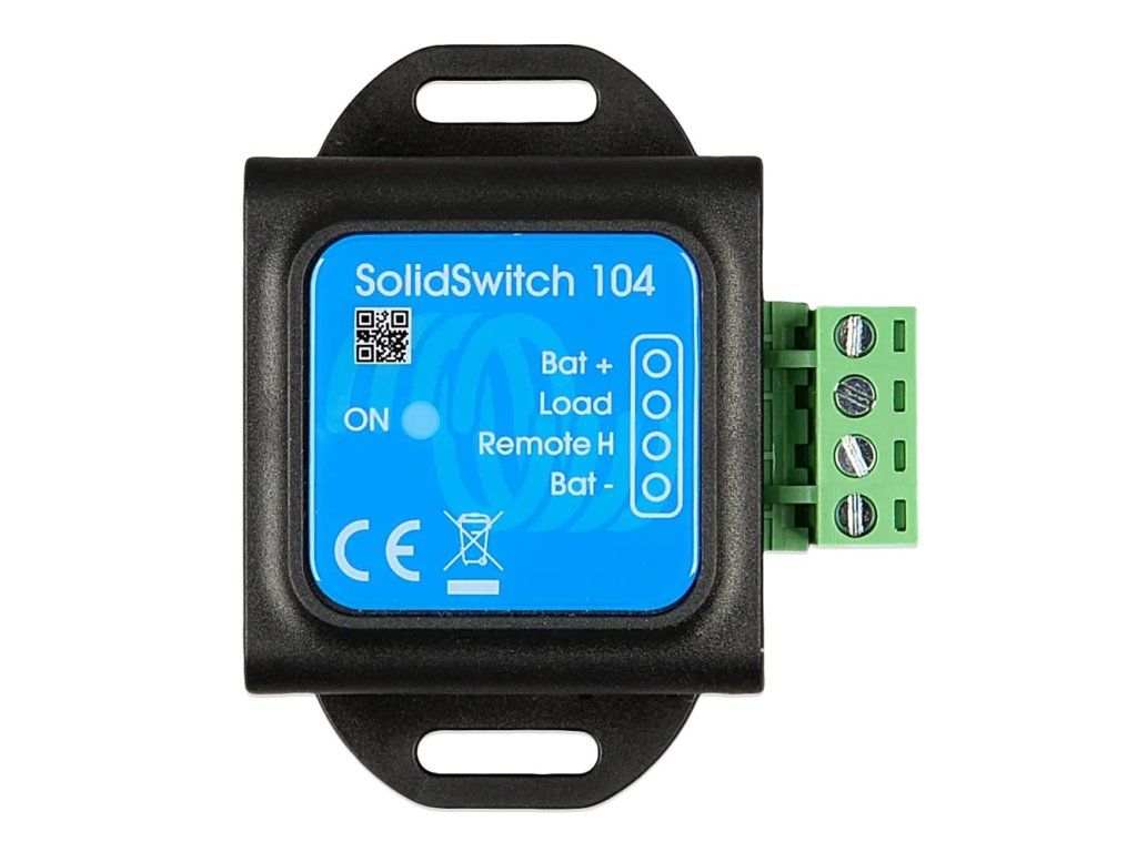 The SolidSwitch 104 is a solid-state DC switch designed for switching DC loads up to 70 V and 4 A. It is controlled by a low-power digital signal, while its own power consumption is very low. This makes it particularly suitable for use in lithium systems where minimising quiescent power consumption is key. The device is designed for integration into Victron Energy systems and finds application, for example, in controlling an external alternator controller or expanding the number of chargers connected to the ATC (allow-to-charge) output of a BMS. Main features and functions Switching DC loads up to 70 V / 4 A - Designed for resistive, capacitive and inductive loads (e.g. coils of power contactors). Very low self-consumption - Consumption of approximately 0.04 Ah per month, which significantly reduces the parasitic load on the battery system compared to a conventional relay. Three typical applications - Control of an external alternator controller (e.g. in a Victron lithium system). - Switching a DC load (e.g. lighting) using a low power control circuit. - Expanding the number of chargers connected to the ATC output of the Victron BMS. Low control current - The minimum input current for switching is 30 µA. Suitable for use with BMS - When the ATC output is permanently active, the device remains active with minimal power consumption, limiting battery discharge. Technical parameters: - Operating input voltage (Vbat): 8-70 V DC - Maximum load current: 4 A Maximum load capacitance: - Vbat up to 15 V: 1000 µF - 15 V < Vbat < 30 V: 400 µF - 30 V < Vbat < 70 V: 50 µF Maximum inductive load: - up to 1 A: 1000 mH - 1 A < I < 2 A: 100 mH - above 2 A: 10 mH Remote input (Vin): - free floating or Vin < 3 V: output off - 3.3 V < Vin < 70 V: output on - minimum input current for switching: 30 µA - Operating temperature: -20 to +50 °C - Humidity: max. 95% (non-condensing) - Protection: IP20 - Material: ABS, matte black - Dimensions (h × w × d): 58 × 66 × 23 mmAdditional parameters