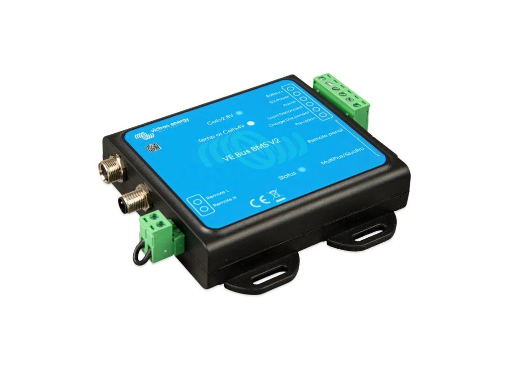 VE.Bus BMS and VE.Bus BMS V2 are battery management systems (BMS) designed to interface and protect one or more Lithium Battery Smart 12.8V or 25.6V (LiFePO4 or LFP) lithium batteries in systems that have Victron inverters or inverter/chargers with VE.Bus communications. It monitors and protects the batteries from over- or under-voltage of any single cell, as well as from over-temperature or under-temperature. Based on the status of the battery or batteries, the BMS: - Generates a pre-alert signal to warn of an impending cell undervoltage condition. - It will disable inverting in VE.Bus inverters or inverter/chargers via the VE.Bus and disable other loads via the "Load Disconnect" terminal in the event of a cell undervoltage condition. - Shuts down charging in VE.Bus inverters or inverter/chargers via the VE.Bus and disables other chargers via the "Charge Disconnect" terminal in the event of a cell overvoltage, undertemperature or overtemperature condition. the "original" VE.Bus BMS is best suited for use in systems without GX equipment. the "new generation" VE.Bus BMS V2 has additional features such as: - Remote controlled on/off terminals. - The ability to turn off the VE.Direct and VE.Can solar chargers via the GX device. - Ability to control the VE.Bus inverter/charger from multiple devices such as Digital Multi Control, VE.Bus Smart dongle and/or GX device. - Auxiliary power input and output terminals that allow the GX device to remain powered in the event of a system shutdown.Additional parameters