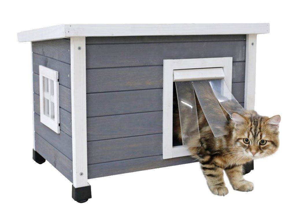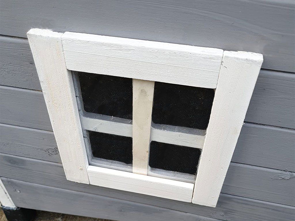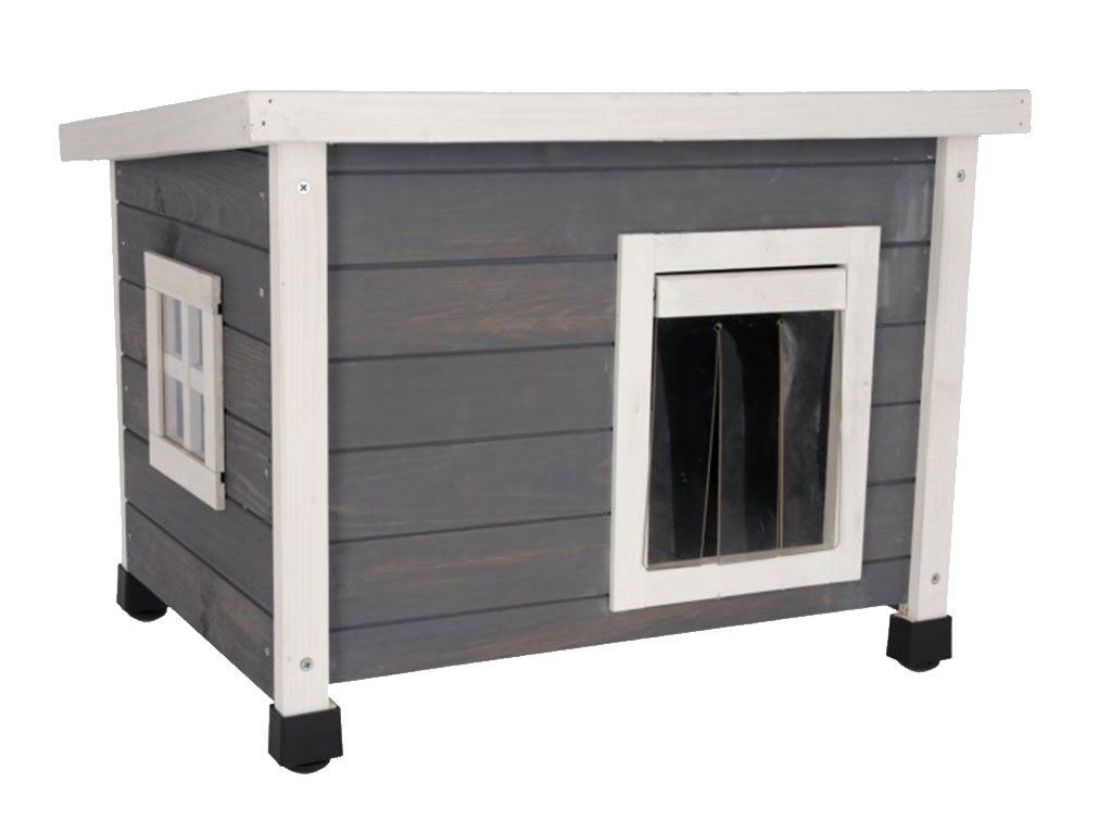 The cat house is equipped with a smallwindow filled with plexiglass,to provide more light indoors. The doors are fitted with hingedtransparent slatsthat catprotect the inside of the shed against wind and cold. The cat kennel has fourheight-adjustable plastic feet.