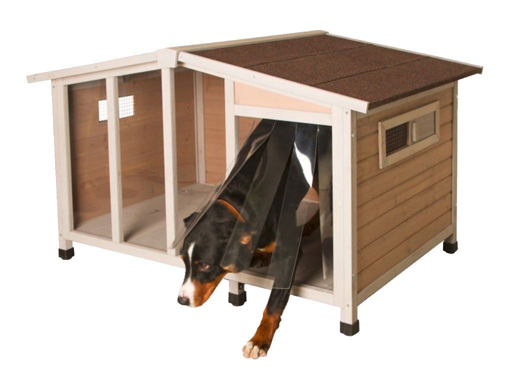 - Entrance dog kennelsit is spacious enough aprotected by a slatted hingeagainst wind and weather.The entrance isspacious enough, so the dog can move comfortably in and out of the kennel.